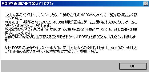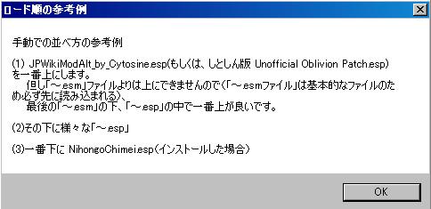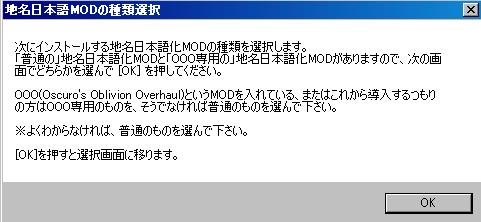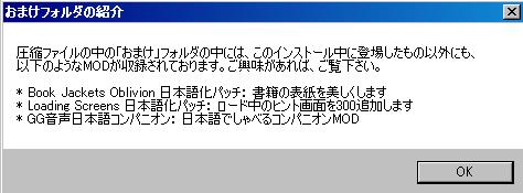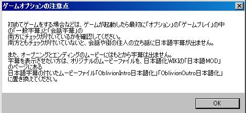 なお、もろみが初日本語化のため、日本語化パッチは安定版のv0.15cを使用する。本体Oblivion.exeのバージョンは1.2.0416であることを前提としている。
