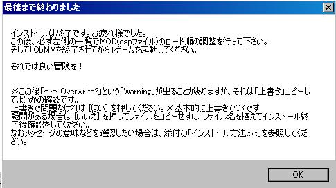 解凍するとobmm_setup.exeが出てくるのでダブルクリックで実行、「Next」クリック、「I accept~」を選択、C:\Games\Oblivionが選択されていることを確認して「Next」クリック、とりあえずチェックそのままにして「Next」クリック、次はよく分からないからデフォルトで「Next」、「Install」クリック。チェックそのままにして「Finish」クリック。
